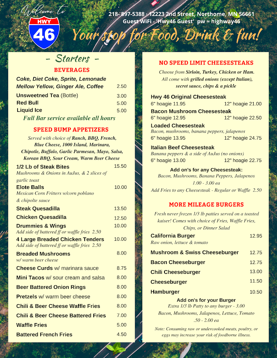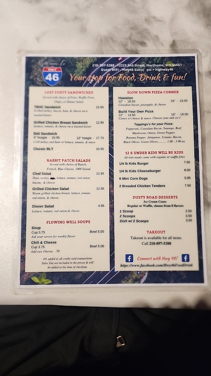 Welcome to Hwy 46 Food & Drink, a shining gem in the heart of Northome, MN. Located at 12079 Main St, this vibrant American restaurant offers a welcoming atmosphere perfect for families, friends, and anyone who appreciates great food and a friendly setting. With a phone number of +1 218-897-5388, it’s easy to call ahead and secure your spot in this local favorite.